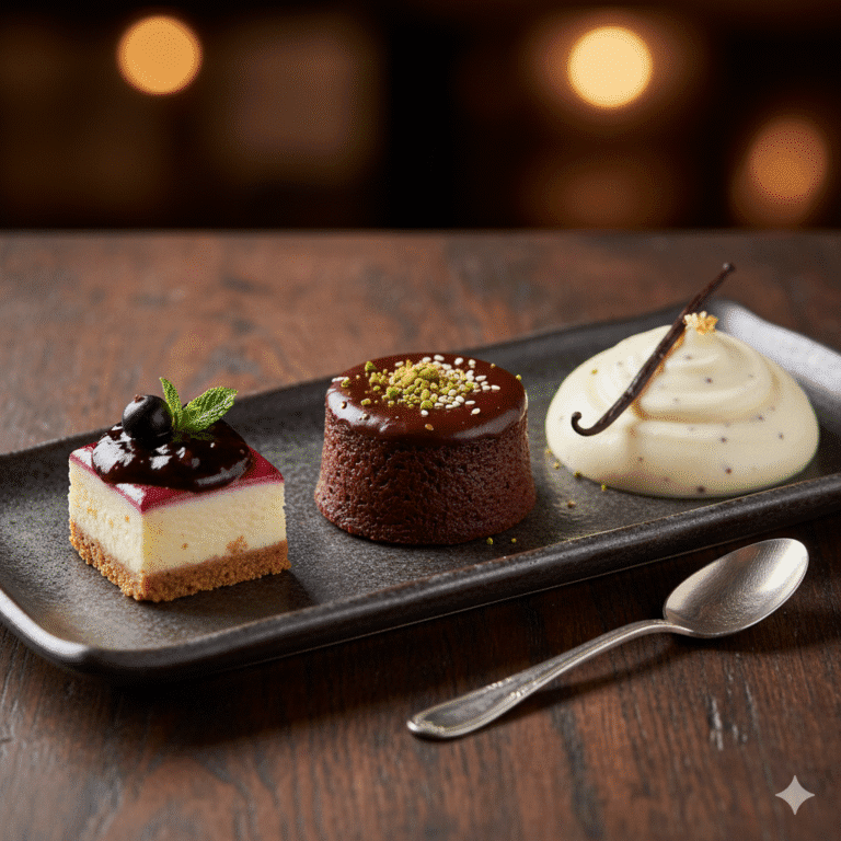 Serve up this trend with a Sweet Petite Flight, offering guests a Black Currant Cheesecake Bite, a Mini Tahini Chocolate Torte, and a dollop of Vanilla Bean pudding.